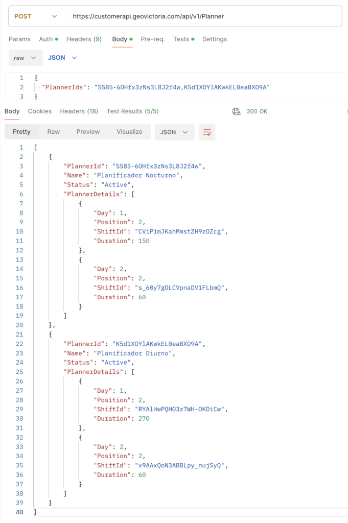 - PlannersIds: se pueden obtener del campo PlannerId que retorna el endpoint Planner/List