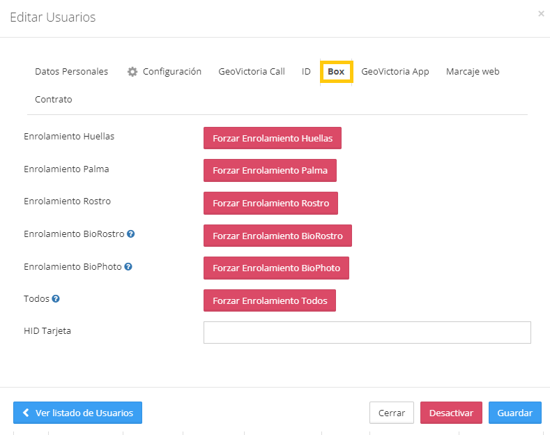 • Una vez en la planilla del trabajador, ir a la pestaña BOX y seleccionar según el enrolamiento que se haya realizado en el Reloj Control forzar enrolamiento que podemos ver en la siguiente imagen y luego guardar.