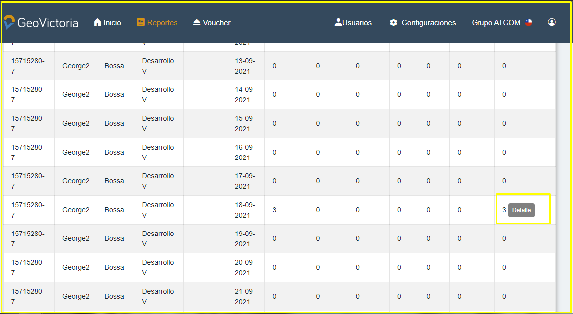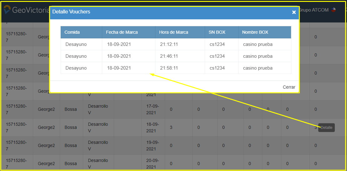 El reporte muestra una lista de los días seleccionados para los usuarios que eligió(en caso de ser por defecto será el día en el que esta revisando el reporte con todos los usuarios que pueden marcar en casino), en este se verán la cantidad de marcas totales según marca(desayuno, almuerzo, once ,cena o fuera de rango). Dentro de este se vera un icono con un “Detalle”, el cual al hacer click en el se podrá ver el detalle de la marca, esto incluye nombre del reloj, sn, el grupo y la hora en que se hizo la marca. Como se puede ver en las siguientes imágenes.