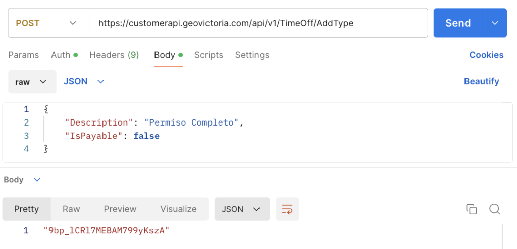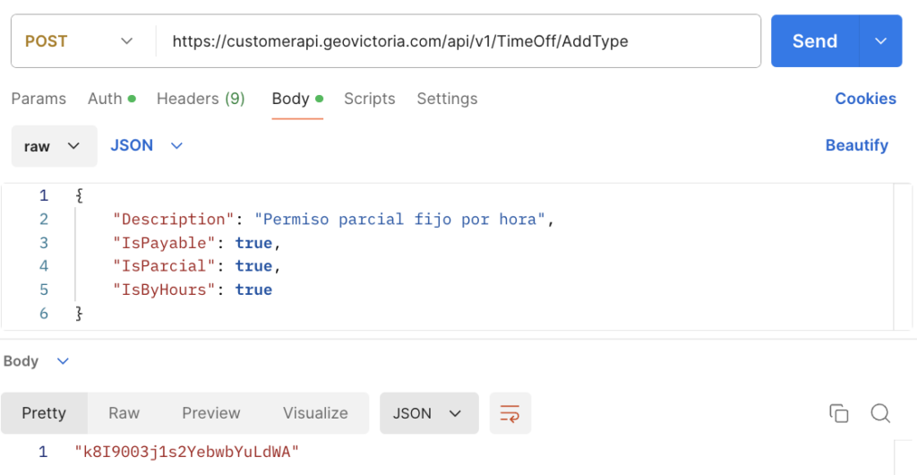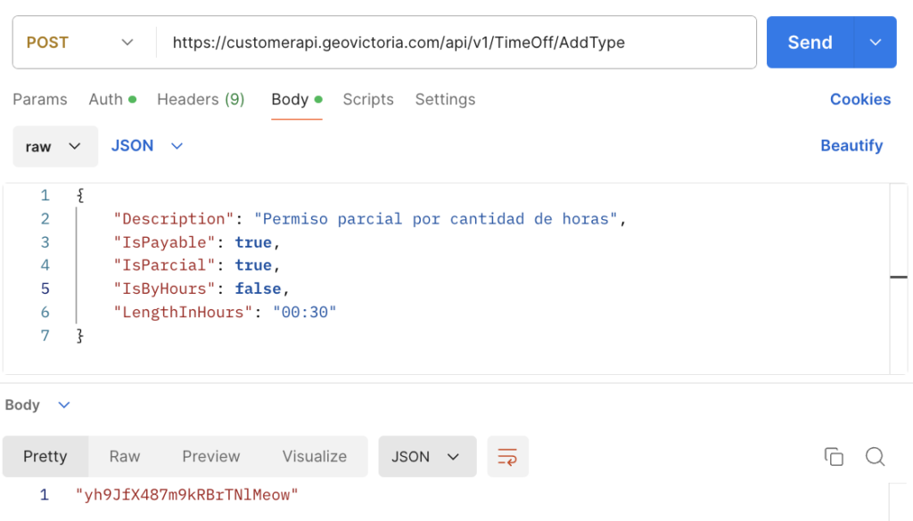 | TimeOffTypeID | String | Id encriptado del tipo de permiso creado |